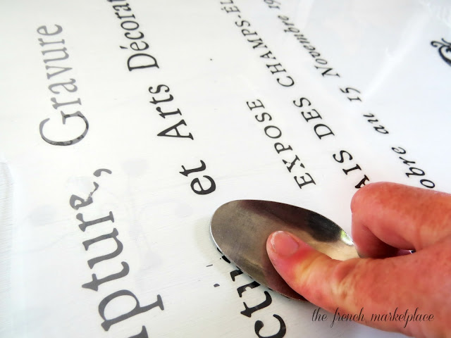 start burnishing. I used the back of a metal spoon and that worked perfectly for me. You can use a spoon or any similar item to burnish. As the image starts to transfer, you will see it appear a shade lighter through the acetate-like material. You can see what I mean in the above photo. See how the letters I'm rubbing are dark, but the ones that I've finished to the left are lighter? When you're all done, slowly lift away the plastic to reveal your masterpiece! If you notice that an area didn't transfer all the way, no biggie, just put the plastic sheet back down and burnish again.
